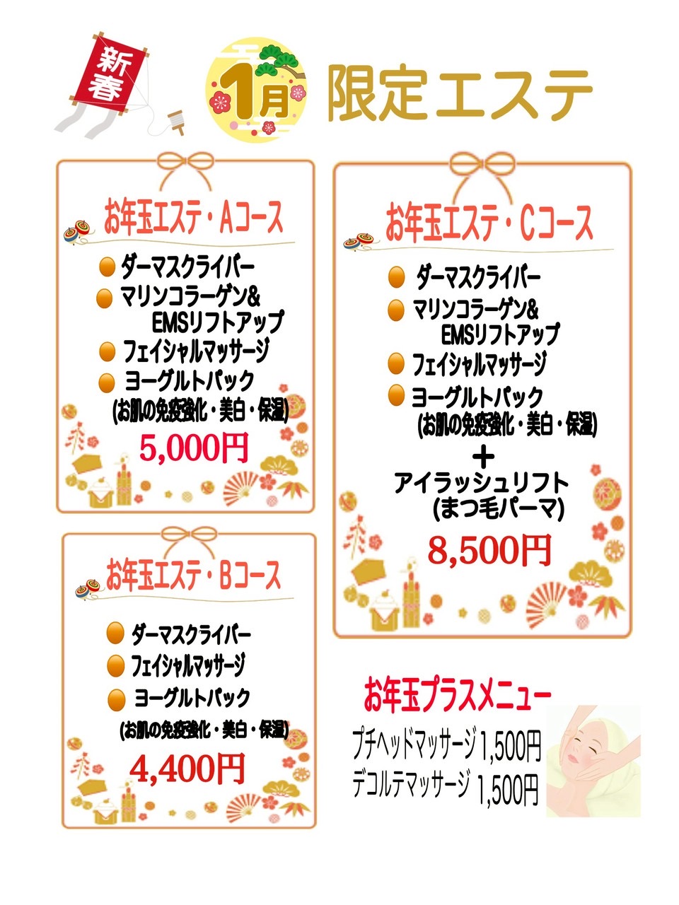 新春限定!1月だけの特別エステ「お年玉エステ」登場🎍 年始の肌と心を整える、贅沢なフェイシャル&リフトアップコースを3種類ご用意しました。 美白・保湿・免疫強化にアプローチするヨーグルトパックや、EMSによるリフトアップ、まつ毛パーマ付きの豪華コースも。 さらに、プラスメニューでヘッドやデコルテのマッサージも追加可能。 一年の始まりに、あなた自身へのご褒美を。