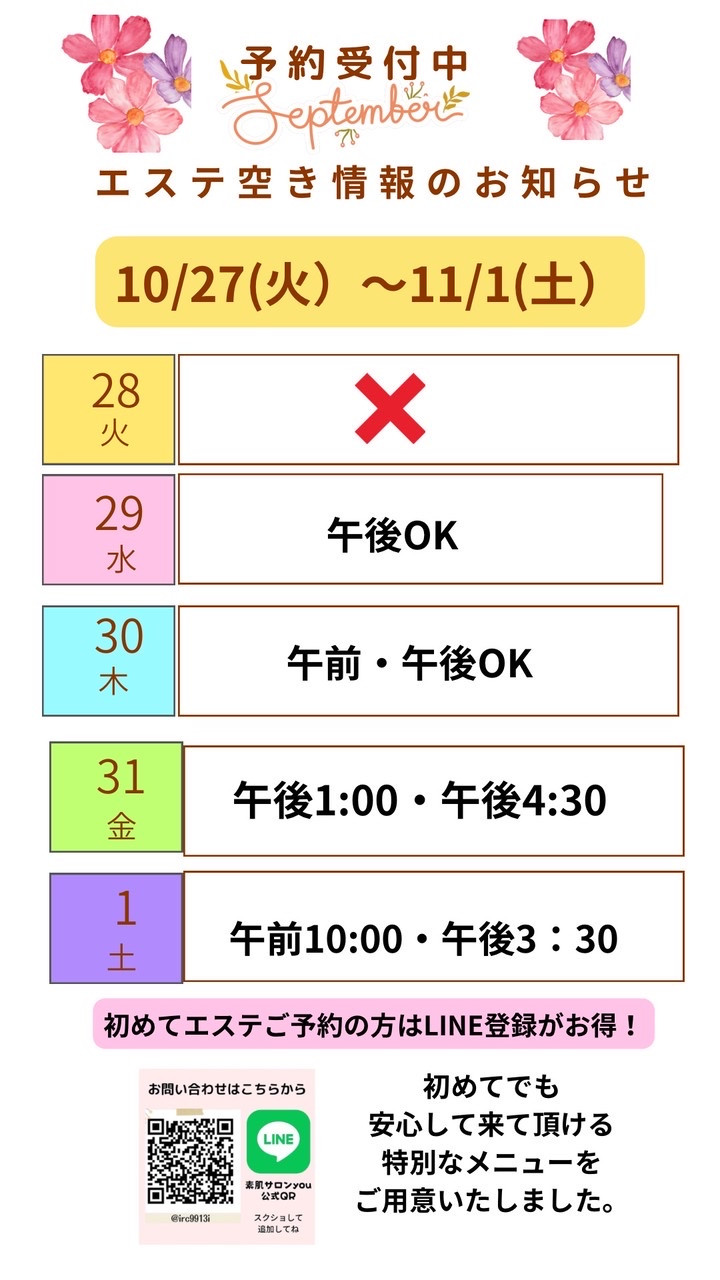 エステ空き情報です😊